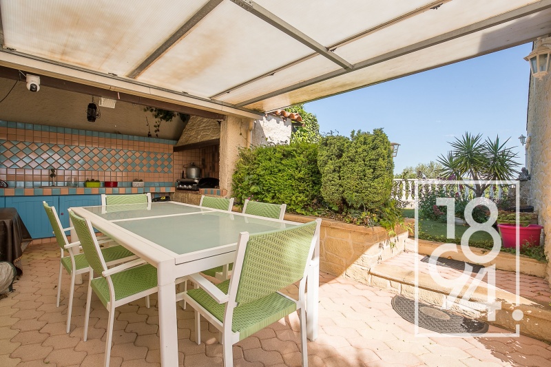 Une vaste terrasse avec cuisine d’été ombragée et brumisateur intégré, idéale pour recevoir et se détendre face à une vue dégagée sur la ville et les collines environnantes.