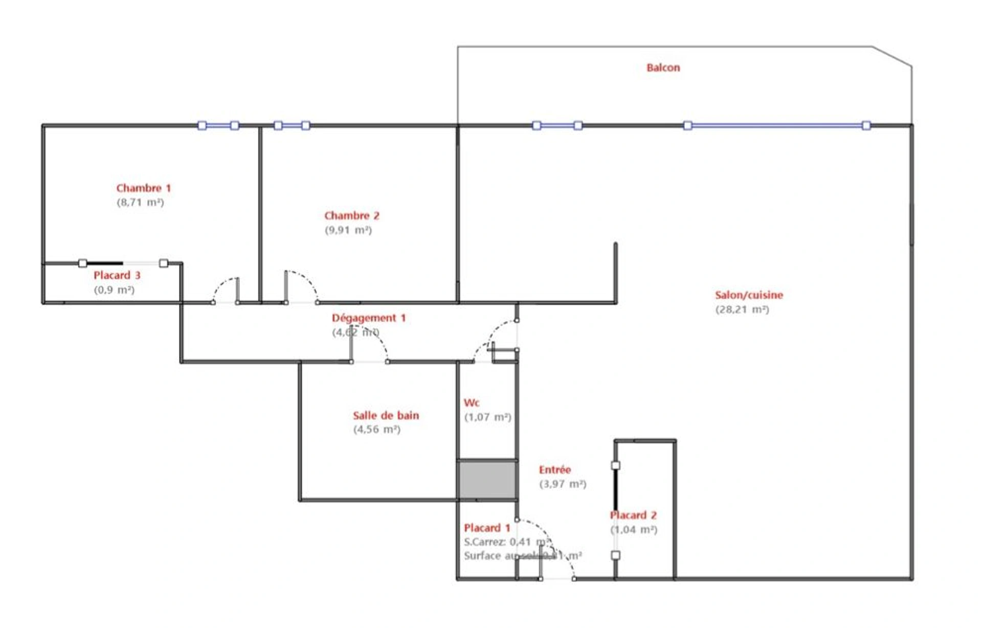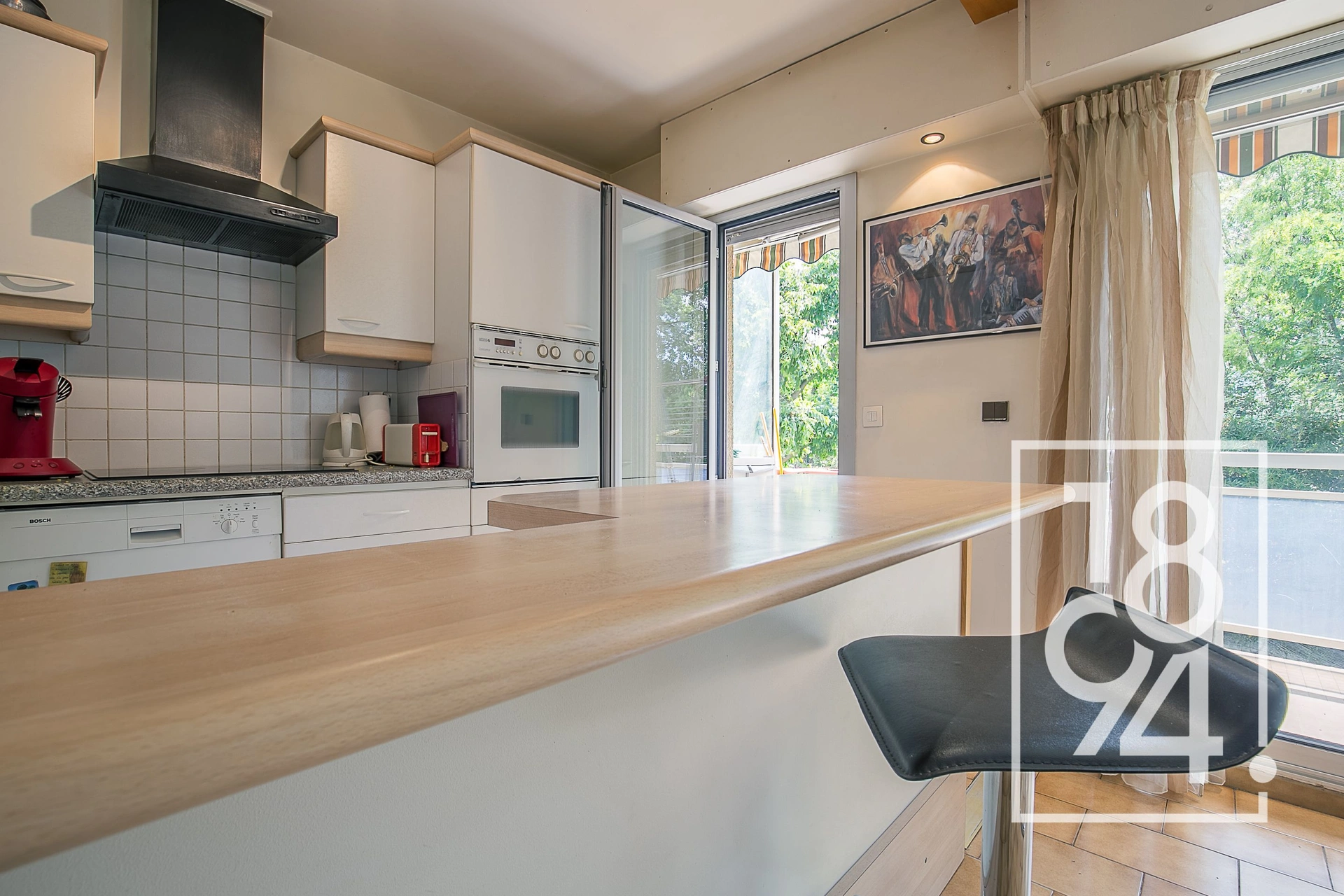 Une entrée avec placard, un salon avec cuisine ouverte donnant sur le balcon orienté Est.