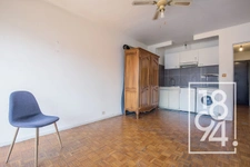 Le séjour, avec sa kitchenette intégrée, est très lumineux avec une exposition Sud-Est, et s'ouvre sur une terrasse ensoleillée, qui donne sur un parking intérieur sans nuisance sonore.