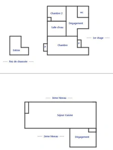 À l’étage inférieur, l’espace nuit se compose d’une chambre d’enfant en second jour, d’une chambre principale avec vue panoramique sur le village, d’une salle d’eau, de WC séparés et d’une buanderie.