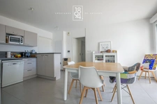 L'appartement se compose d'une entrée qui donne directement sur une pièce à vivre de 26 m2 avec cuisine ouverte meublée, un espace repas pour pouvoir recevoir et petit coin salon cosy avec accès à une belle terrasse de 16 m2 exposée à l'ouest et au calme.