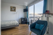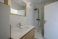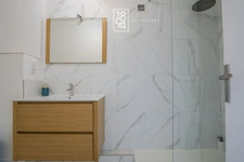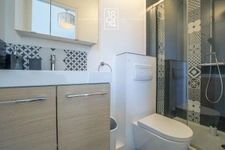 Le second appartement de 20 m² dispose de deux grandes ouvertures sur l’extérieur et comprend un séjour, un coin cuisine, ainsi qu’une salle d’eau avec WC.