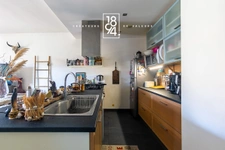Le bien se compose d'une pièce de vie lumineuse de près de 37m2 avec cuisine US entièrement équipée, de deux chambres de 12,47m2 et 11,20m2 avec des rangements intégrés, et d'une salle d'eau avec coin buanderie, ainsi que des WC séparés.