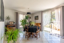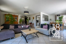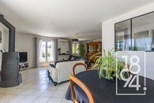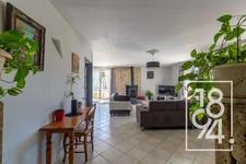 Dès l’entrée, vous découvrirez une spacieuse pièce de vie lumineuse et climatisée, offrant de beaux volumes et de nombreuses ouvertures sur les terrasses qui entourent la maison.