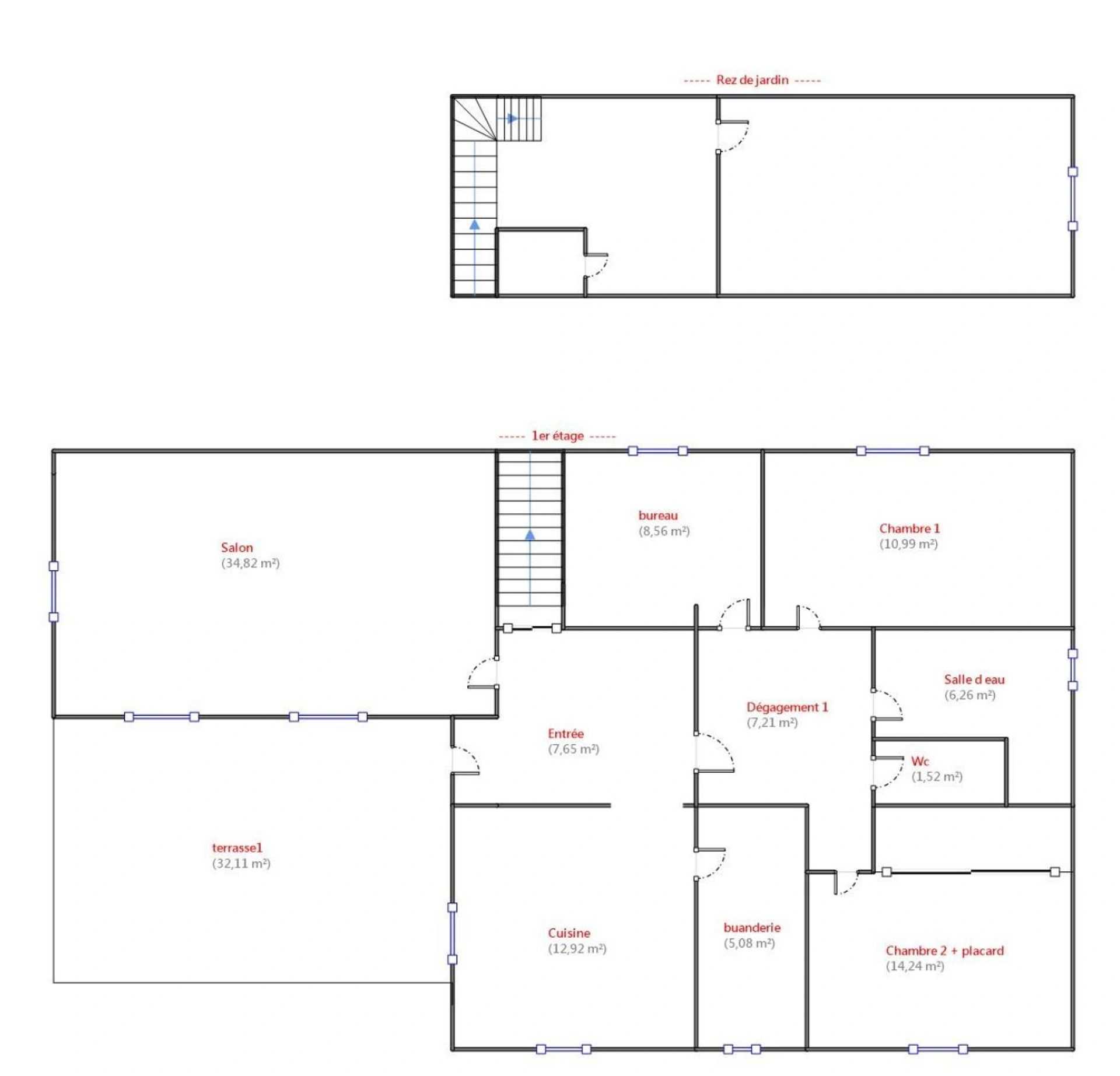 Le coin nuit de 3 chambres ( 11, 14 et 11 m2 ), un bureau ( 8, 5 m2 ).