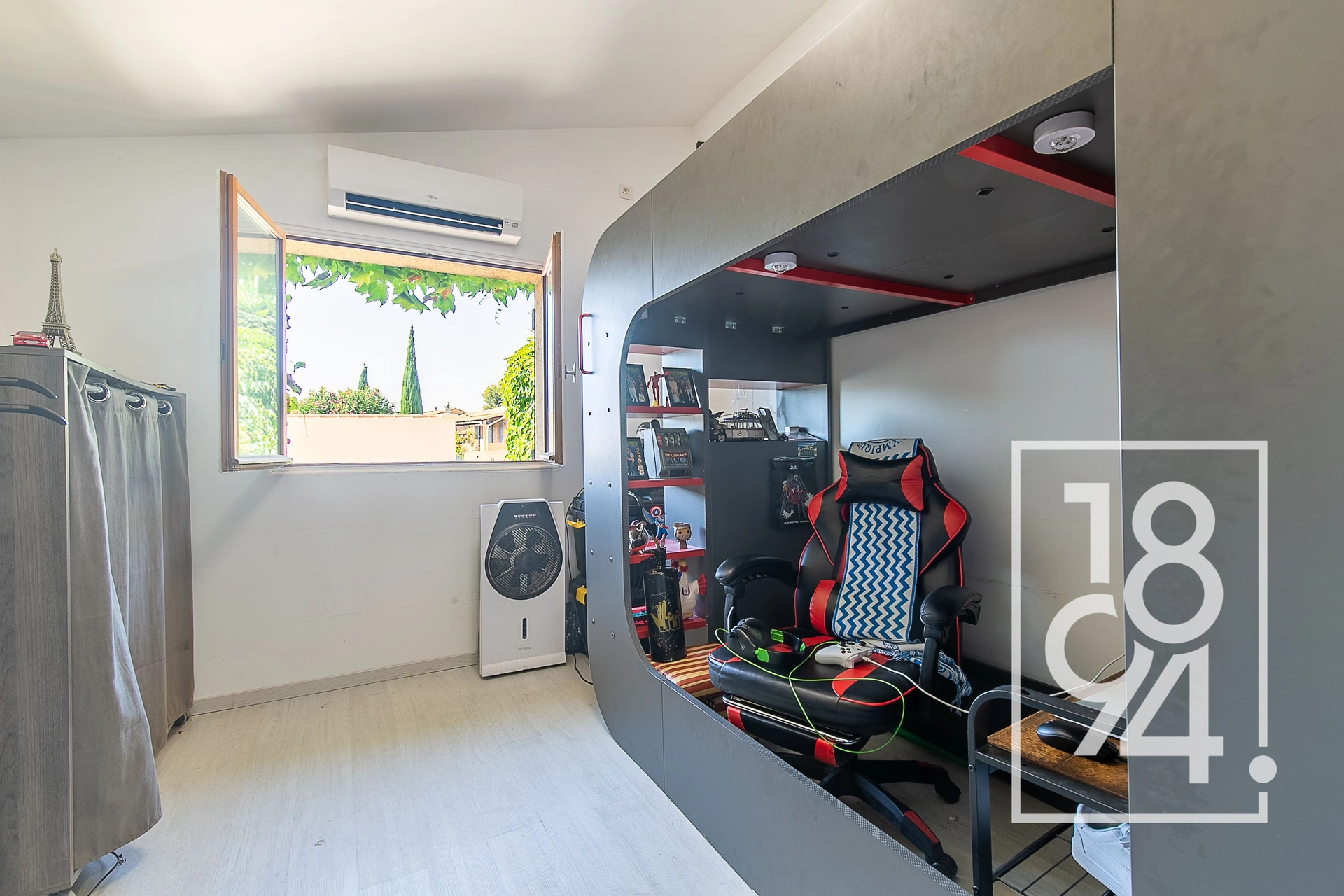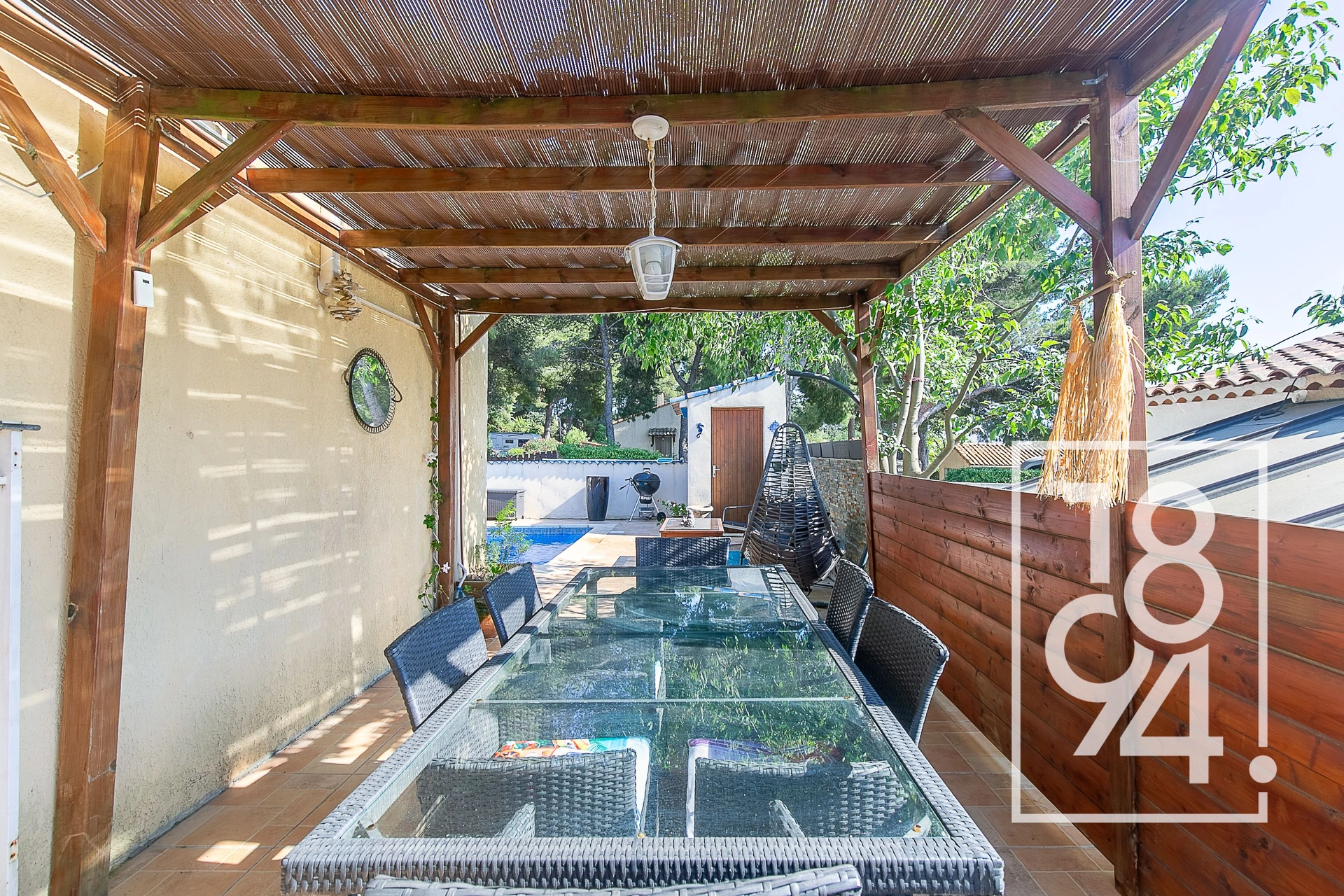1894 l'immobilier vous présente une Maison construite en 1987 de plain pied, T5 avec 4 chambres, pour une superficie habitable de 106 m2 dont 89 environ en carrez, sur une parcelle de terrain de 400 m2 environ avec terrasses, piscine, et stationnements.